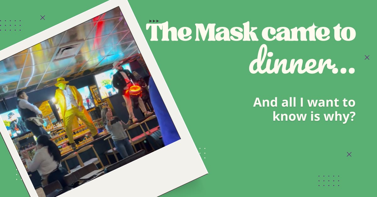 First, a Congo line started. Seems mildly charming but not alarming. Then, The Mask made an appearance. Yes. THE Mask. And he was club dancing? Shimmying, shaking, and jirating to the music. There were women standing up to join him, some waving him over to get a little more……. personal.